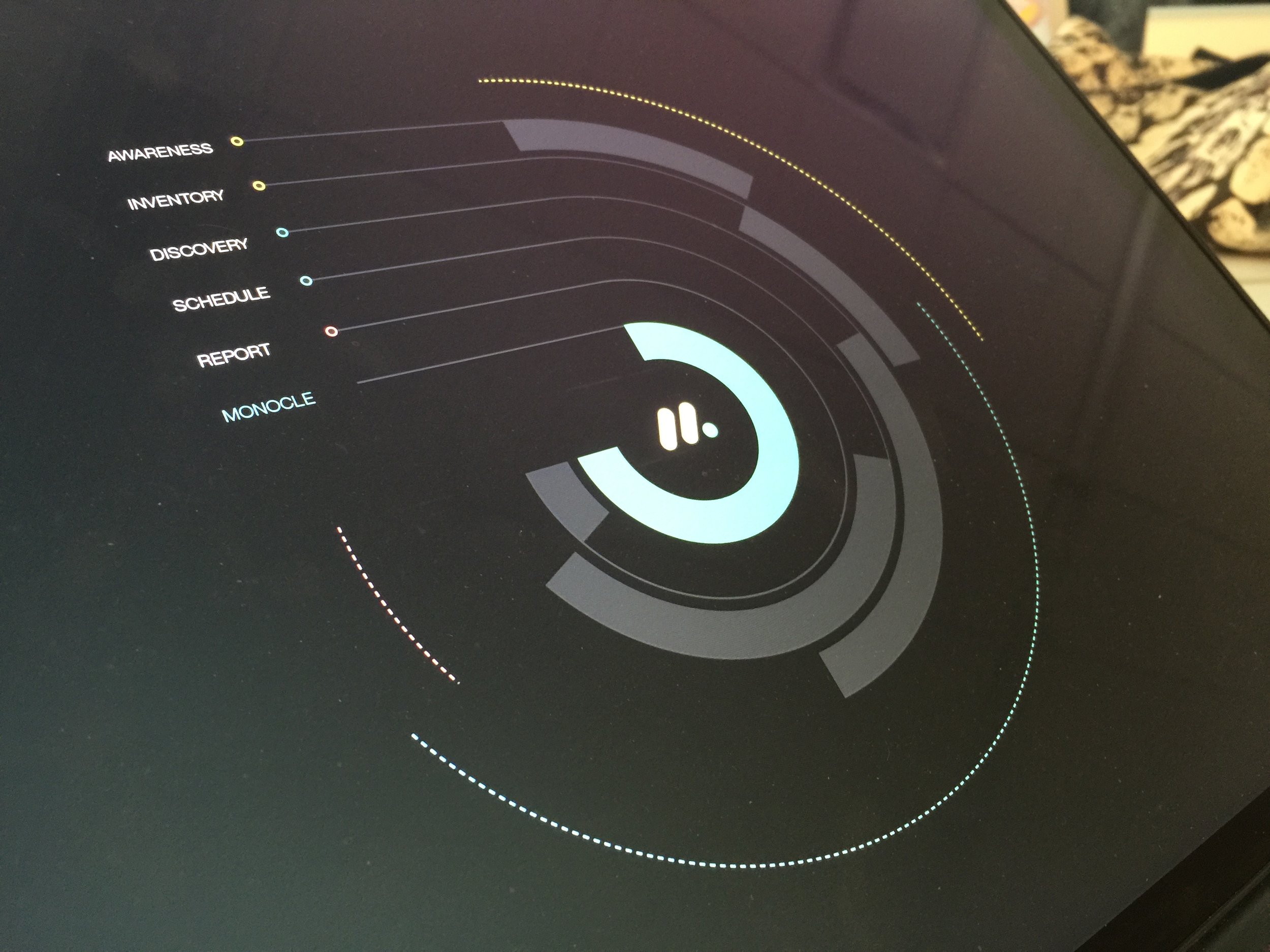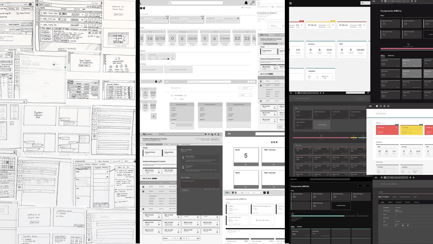 Prototype Evolution. The progression from paper prototypes to wireframes to high-fidelity coded prototypes over the five-week incubator. Fun fact! The color palettes used for the Project Monocle prototype all came from System Admin server environments. (Red, yellow, and green cables, gray from the server racks.)