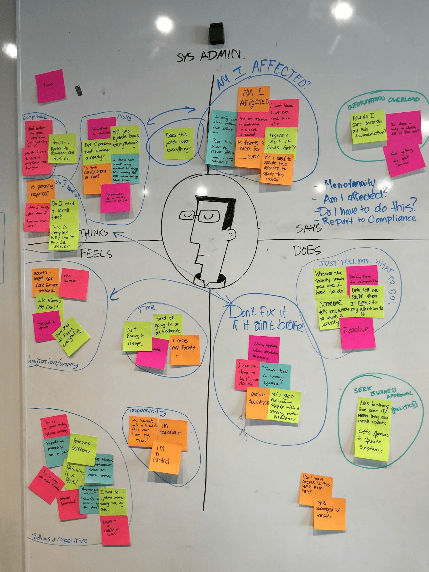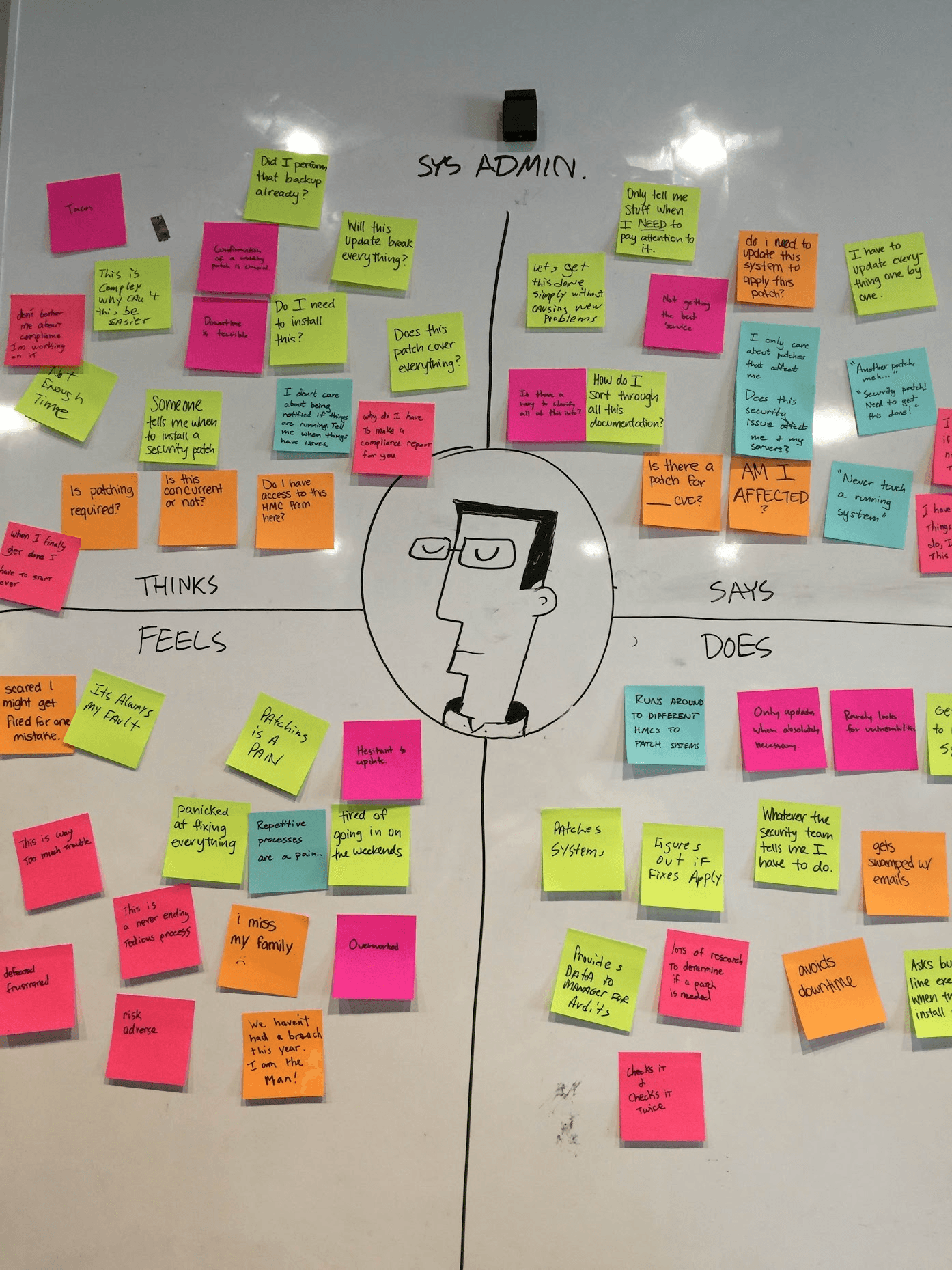 Empathy Map Synthesis. System Administrator empathy map: Thinks, Feels, Says, Does quadrants filled from SME sessions before user interviews.