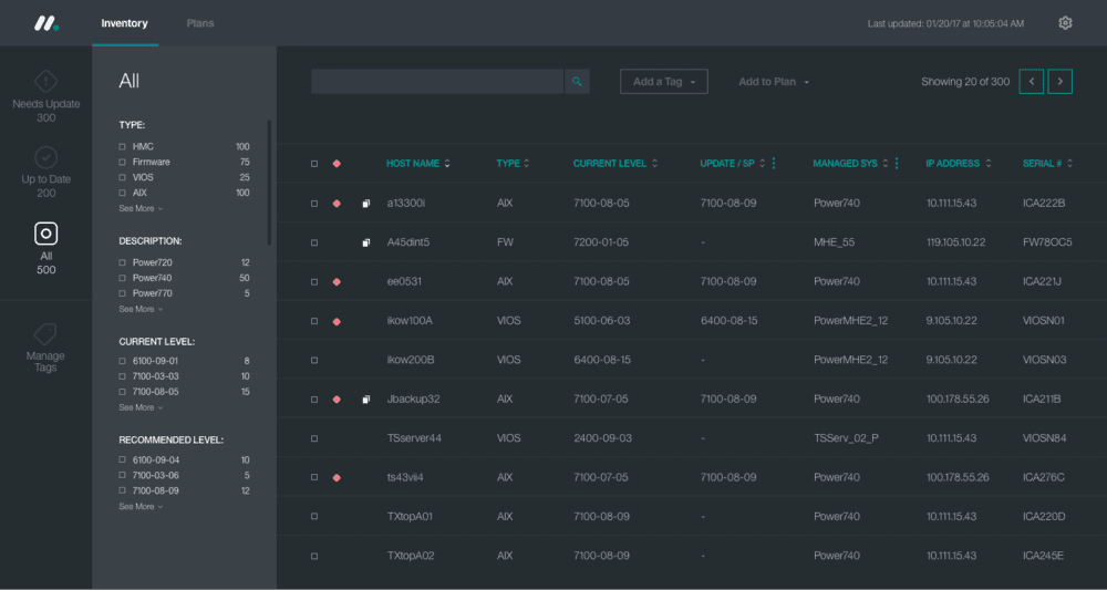 Inventory View (Hallmark). The full environment in a single table. Every endpoint filterable by type, description, current level, and recommended level. Administrators could see at a glance what needed attention across hundreds of machines without opening a single XML file.