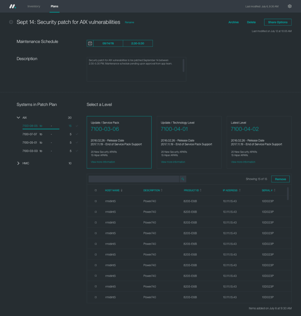 Patch Plan (Hallmark). Scheduling a maintenance window meant selecting a date, choosing a fix level, and seeing exactly which systems were in scope. Teams could name, describe, share, and archive plans, giving everyone from the administrator to the auditor a clear record of what was patched, when, and why.
